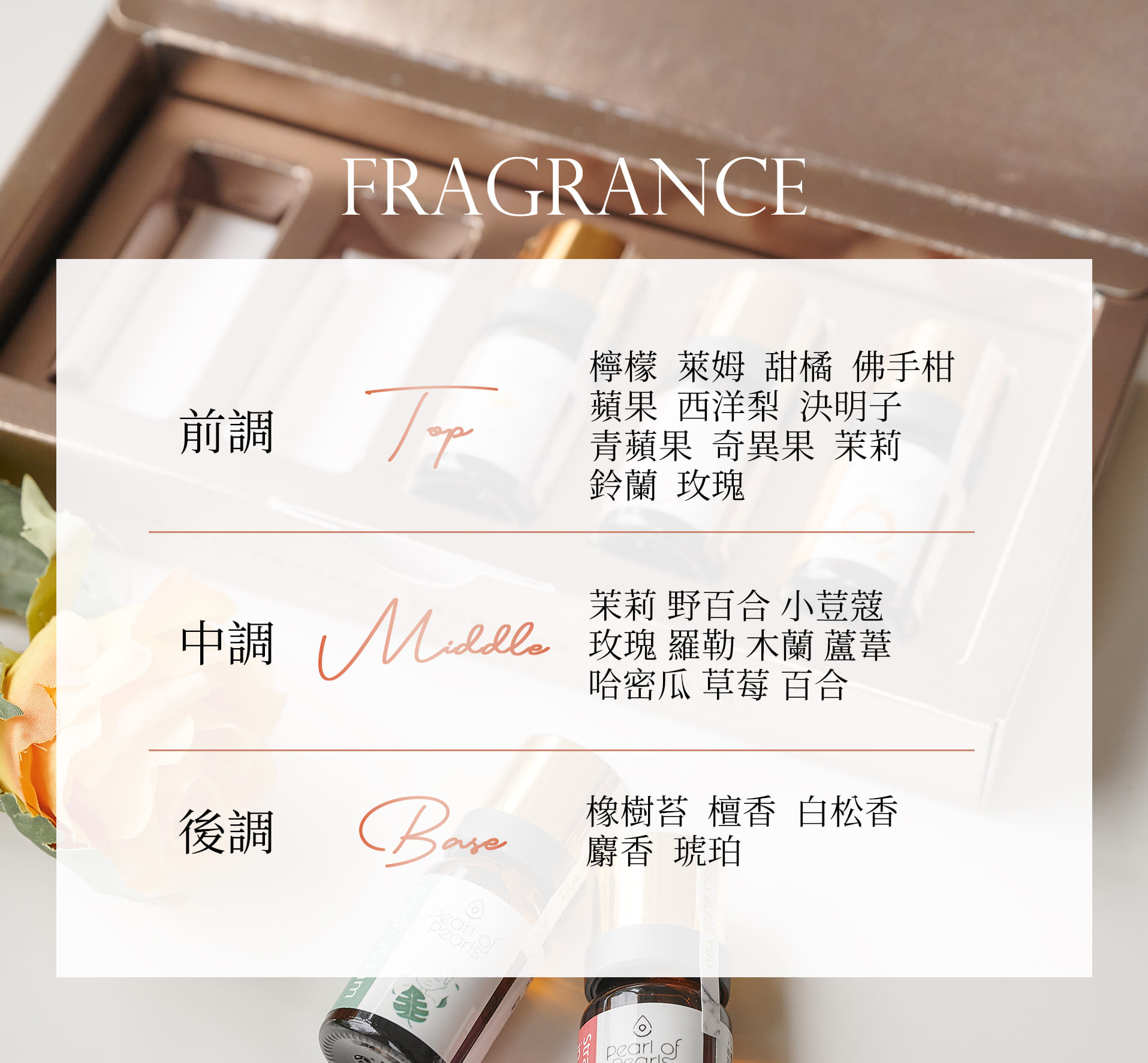 【前味】檸檬、 萊姆、 甜橘、佛手柑、蘋果、 西洋梨、決明子、青蘋果、 奇異果、茉莉、鈴蘭、玫瑰