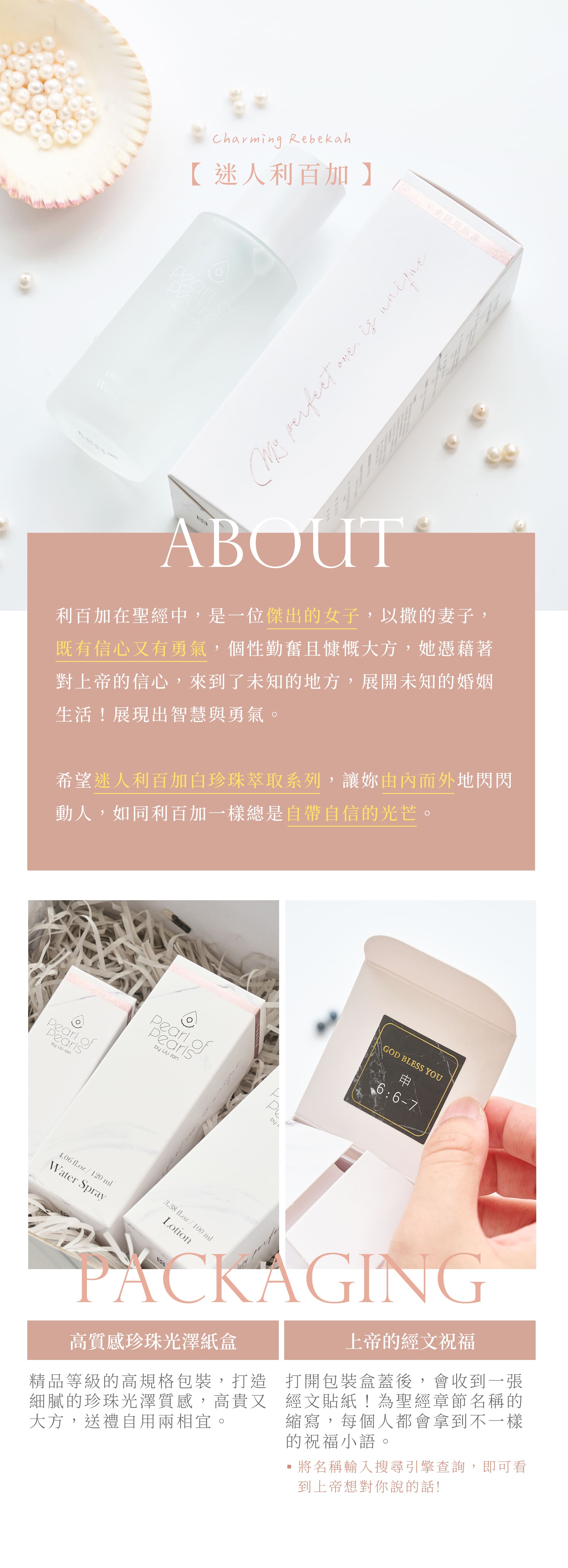 並且都添加了萬能成分的抗氧化維他命E,是保護肌膚的天然屏障。 - 經文瓶身包裝,來自上帝獨一無二的祝福