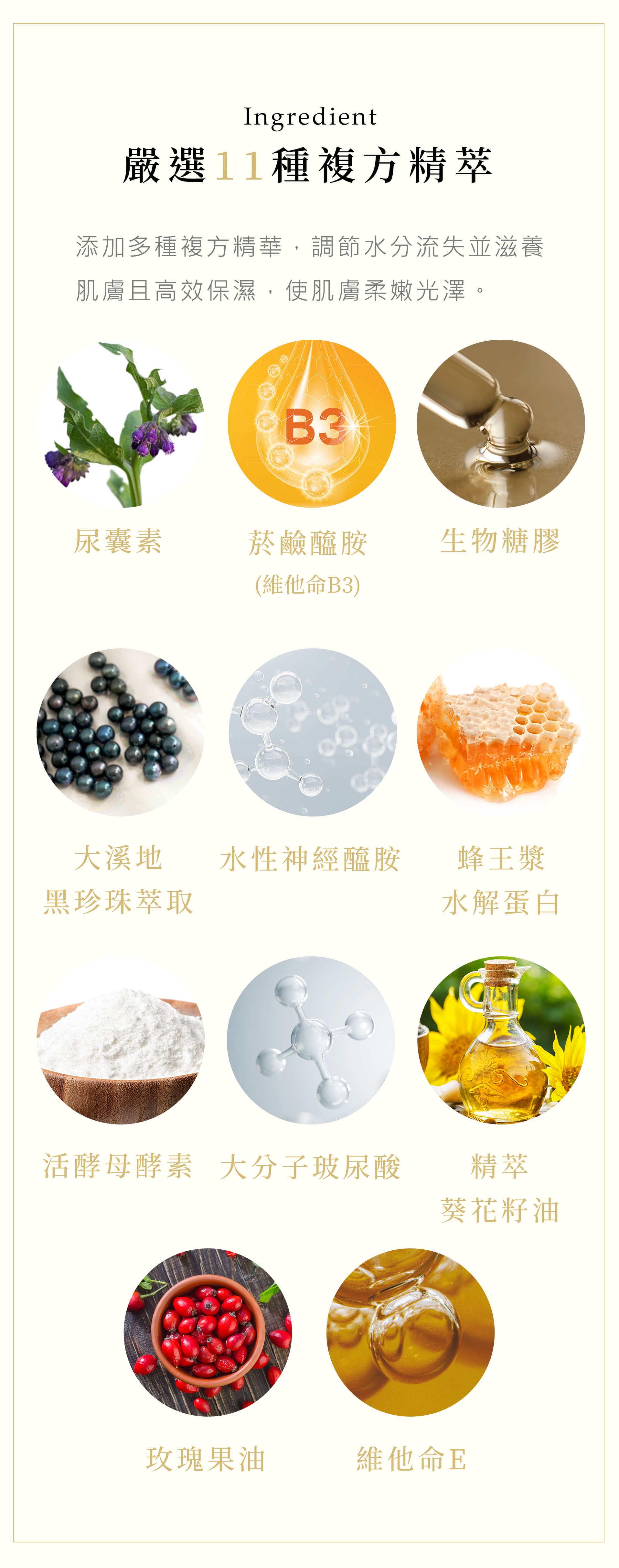 - 深層潤澤肌膚、提亮膚色、延緩老化,提升肌膚防禦力