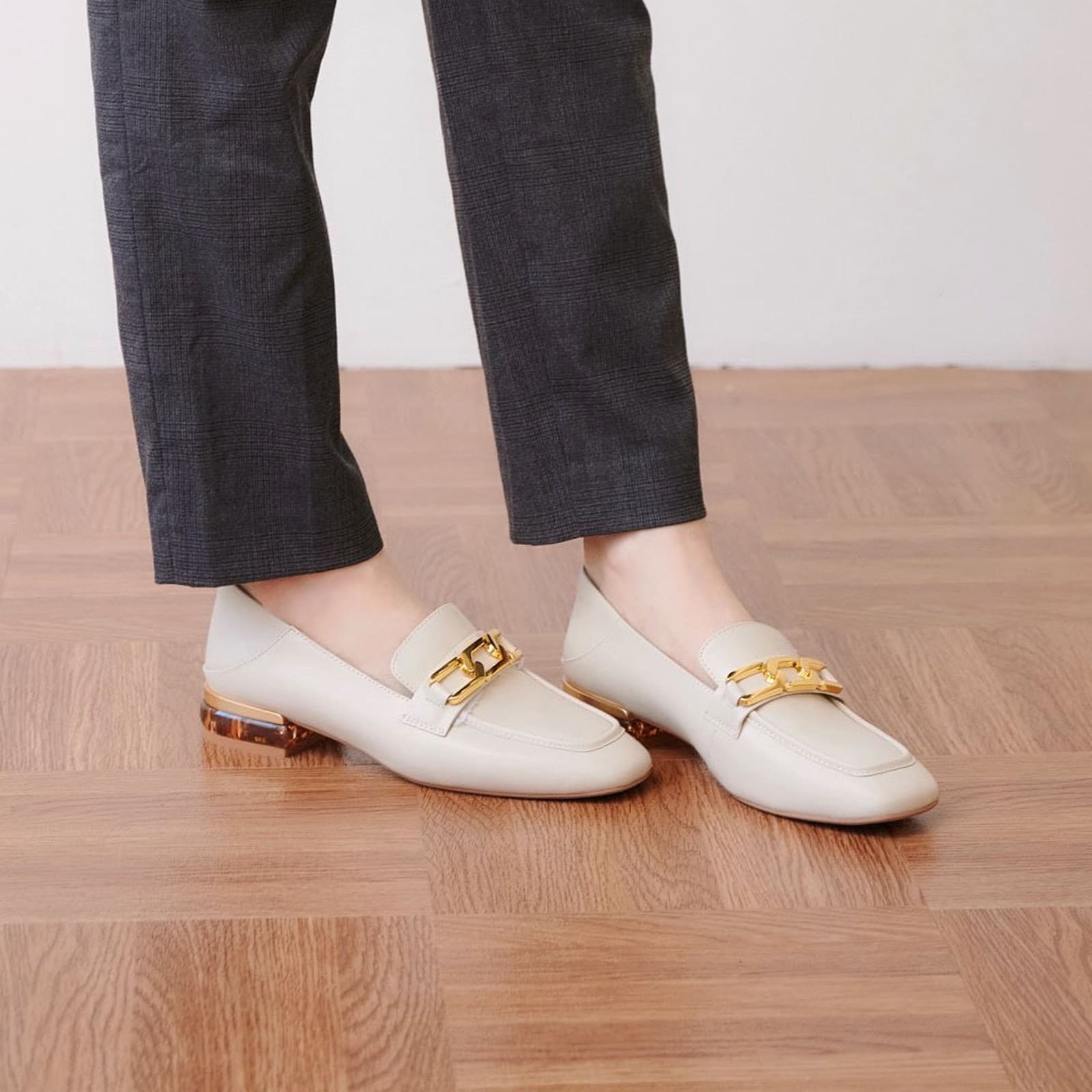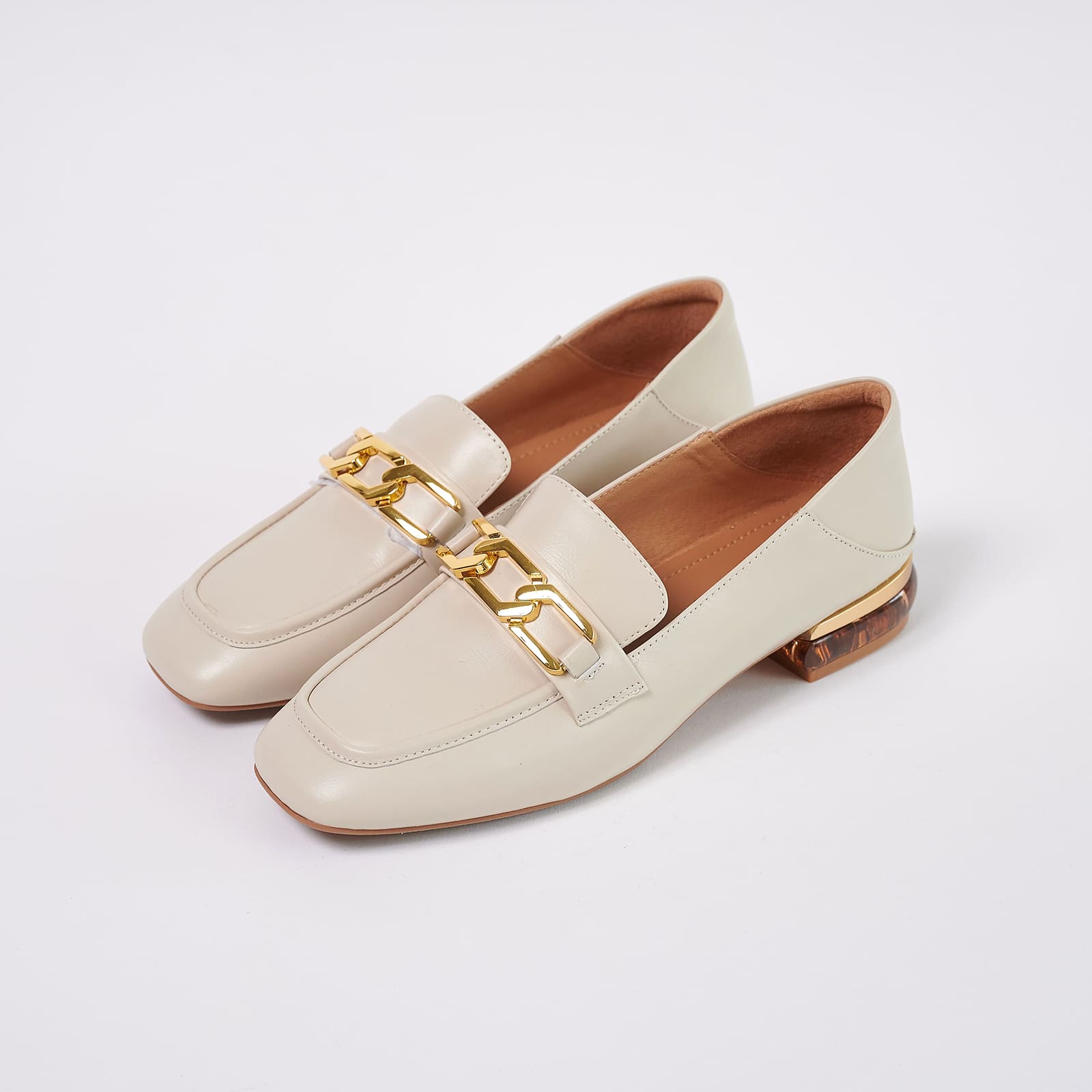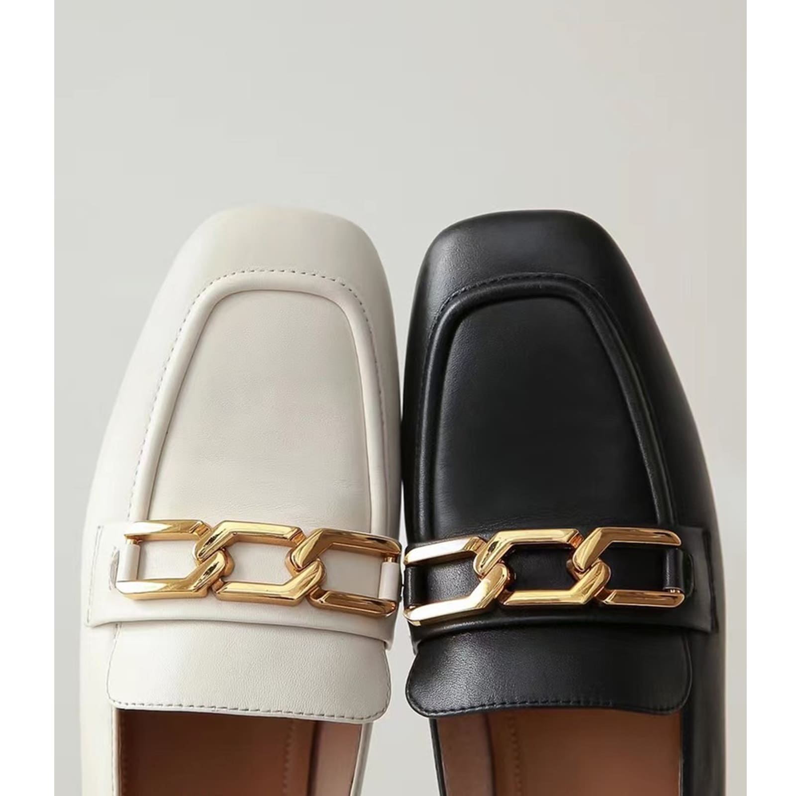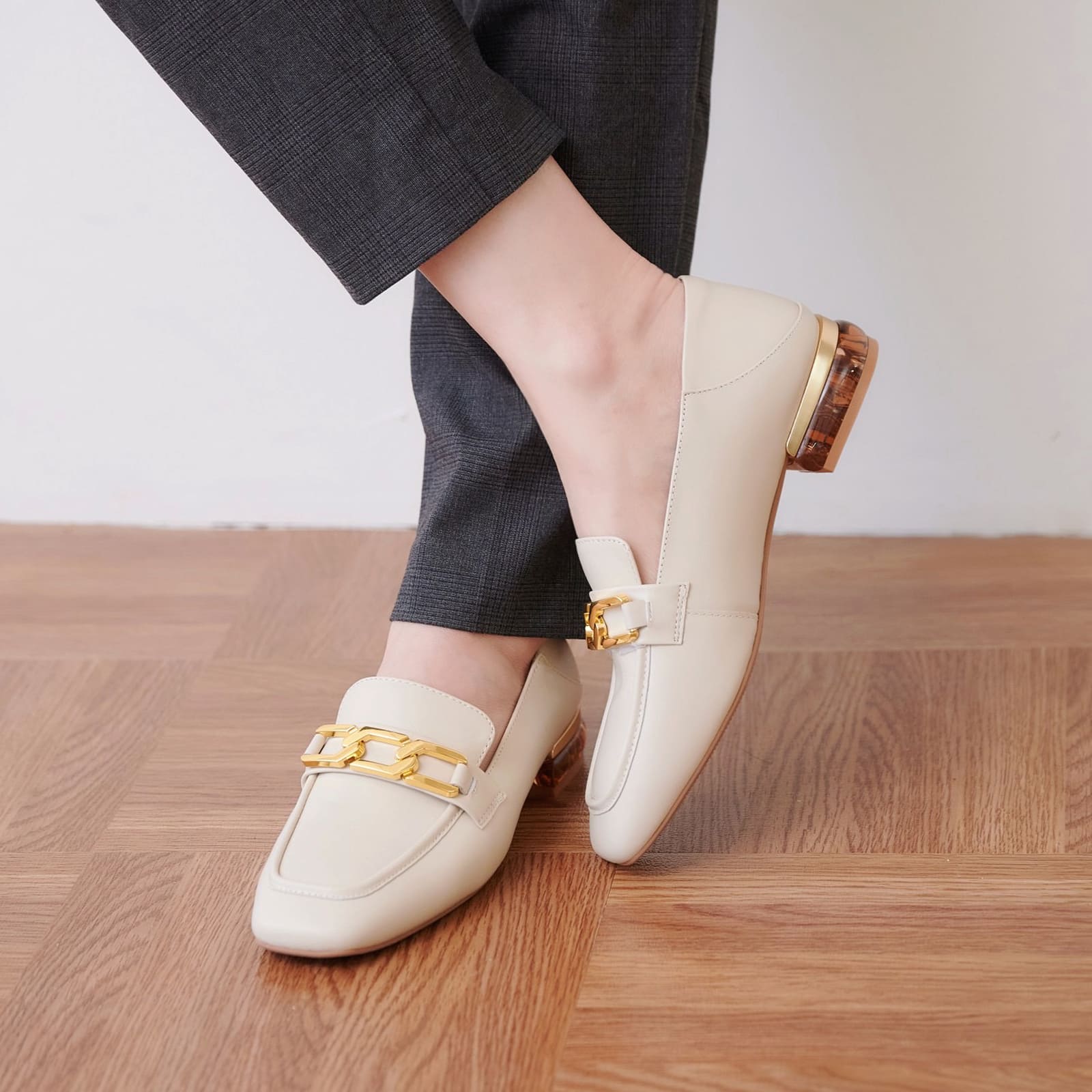 【法式優雅】超柔嫩胎牛皮造型低跟樂福鞋_金鏈杏白(24.5)