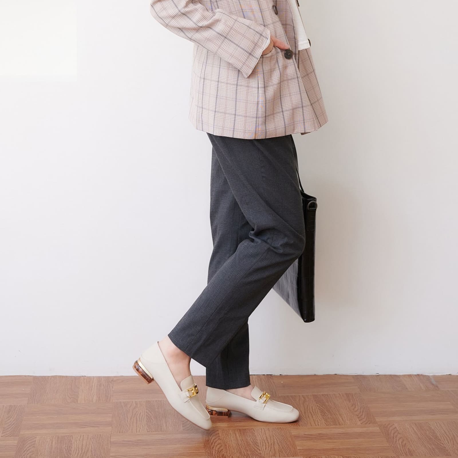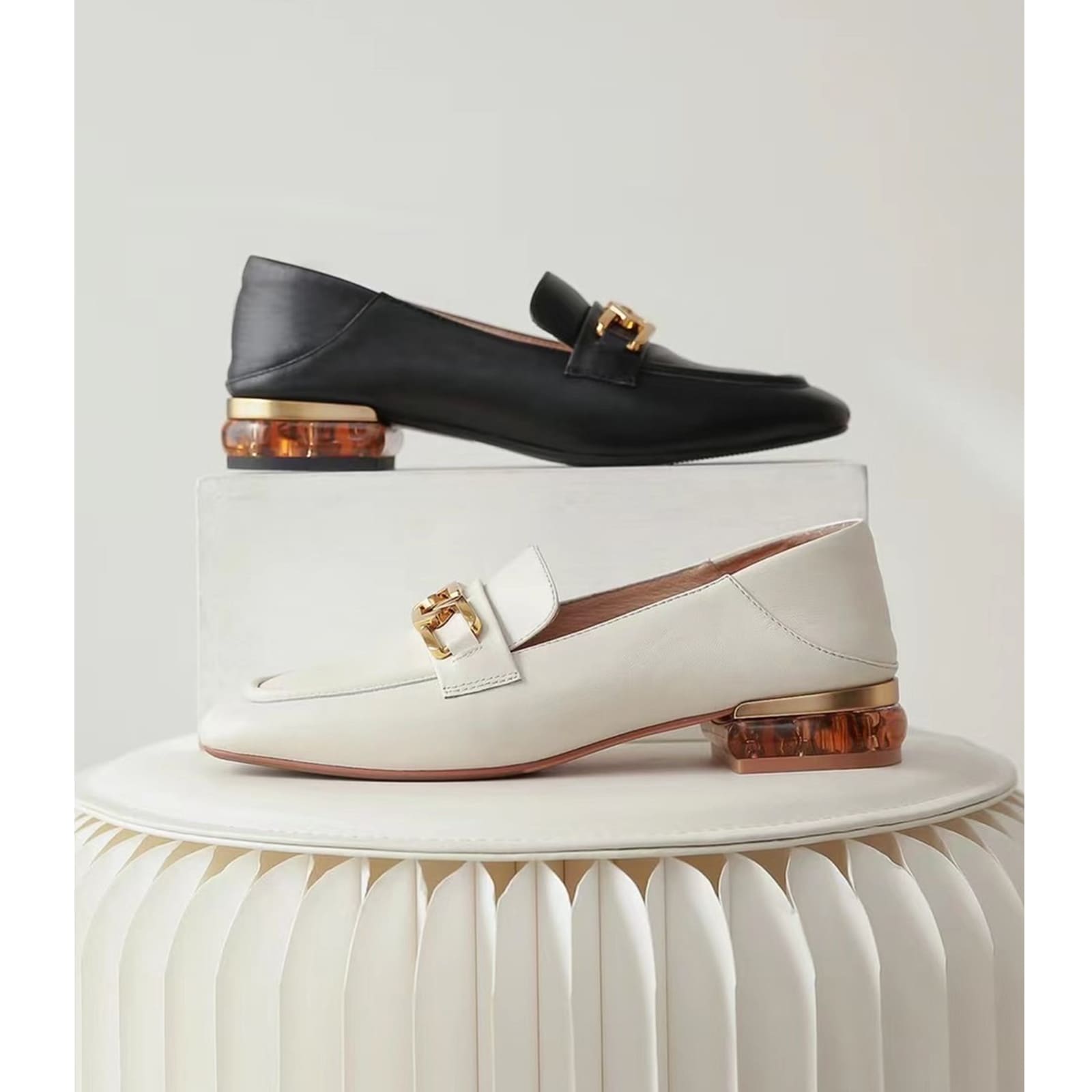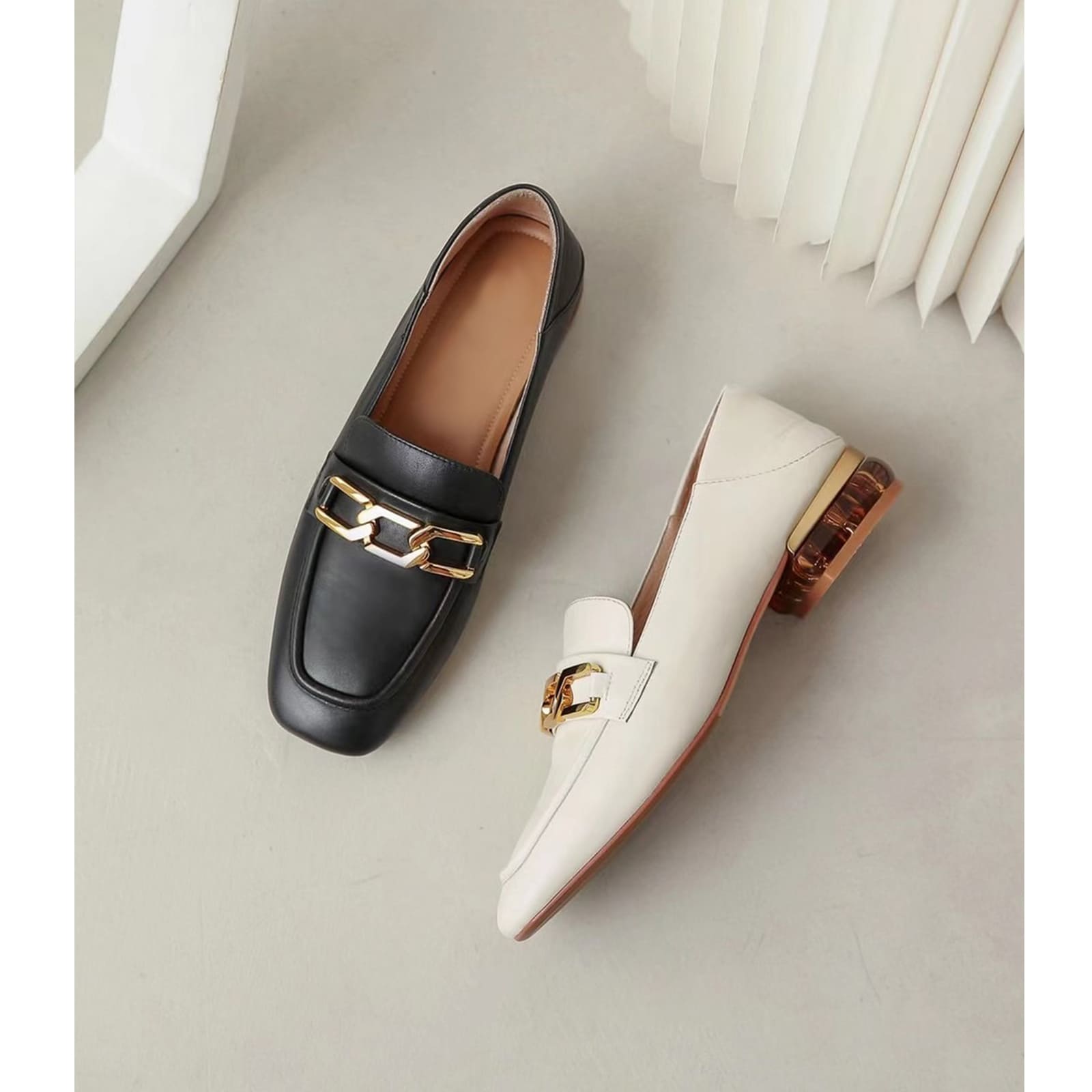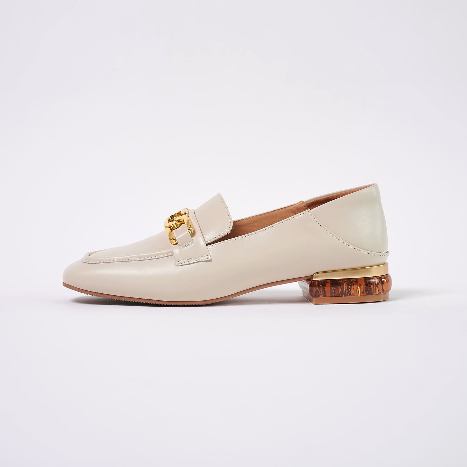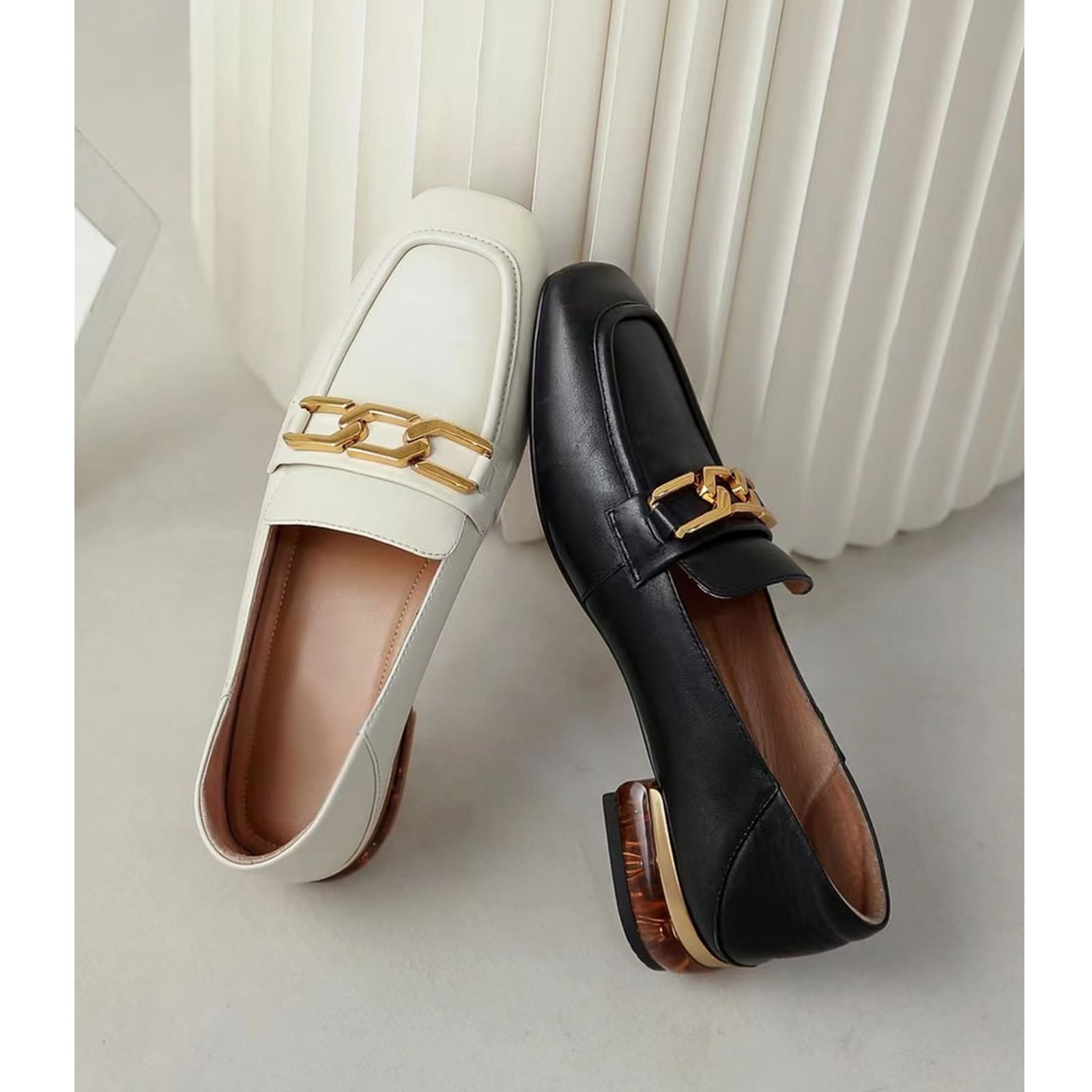 【法式優雅】超柔嫩胎牛皮造型低跟樂福鞋_金鏈杏白(24.5)