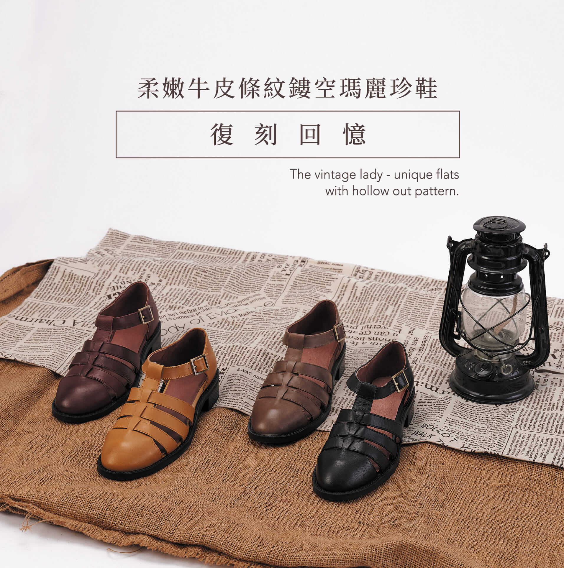 【復刻回憶】柔嫩牛皮條紋鏤空瑪麗珍鞋