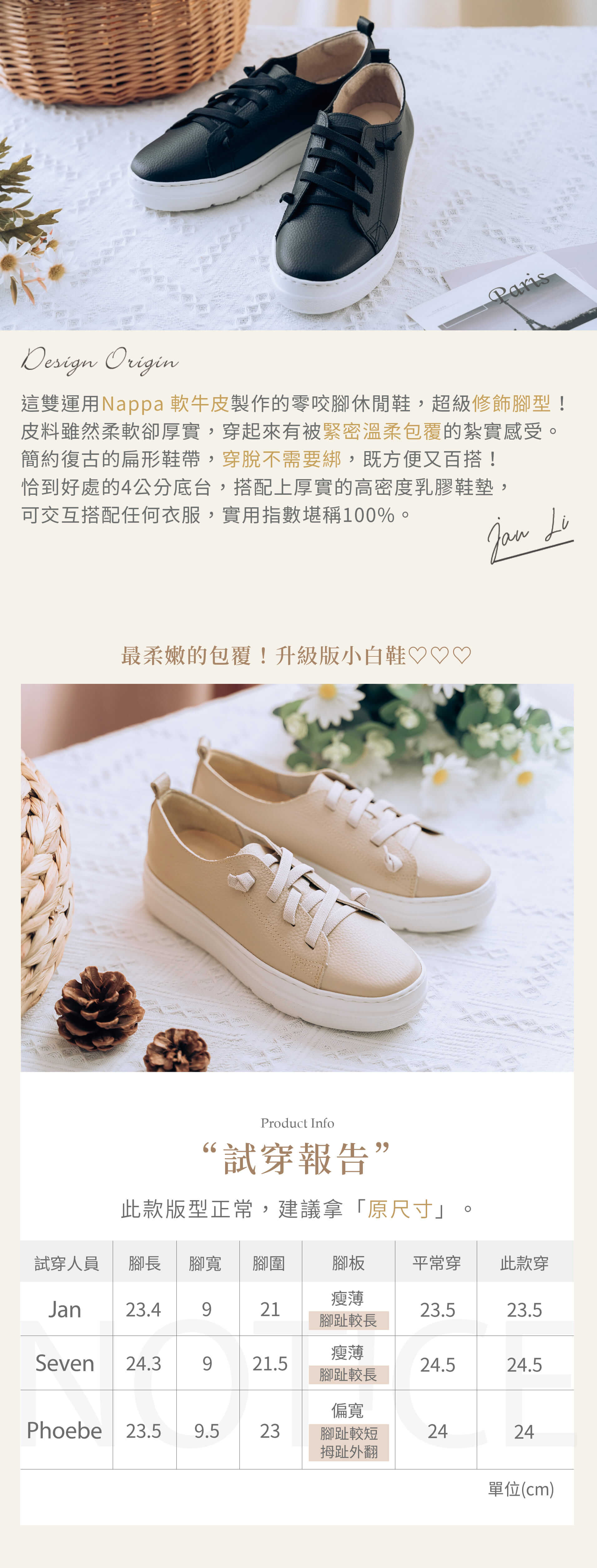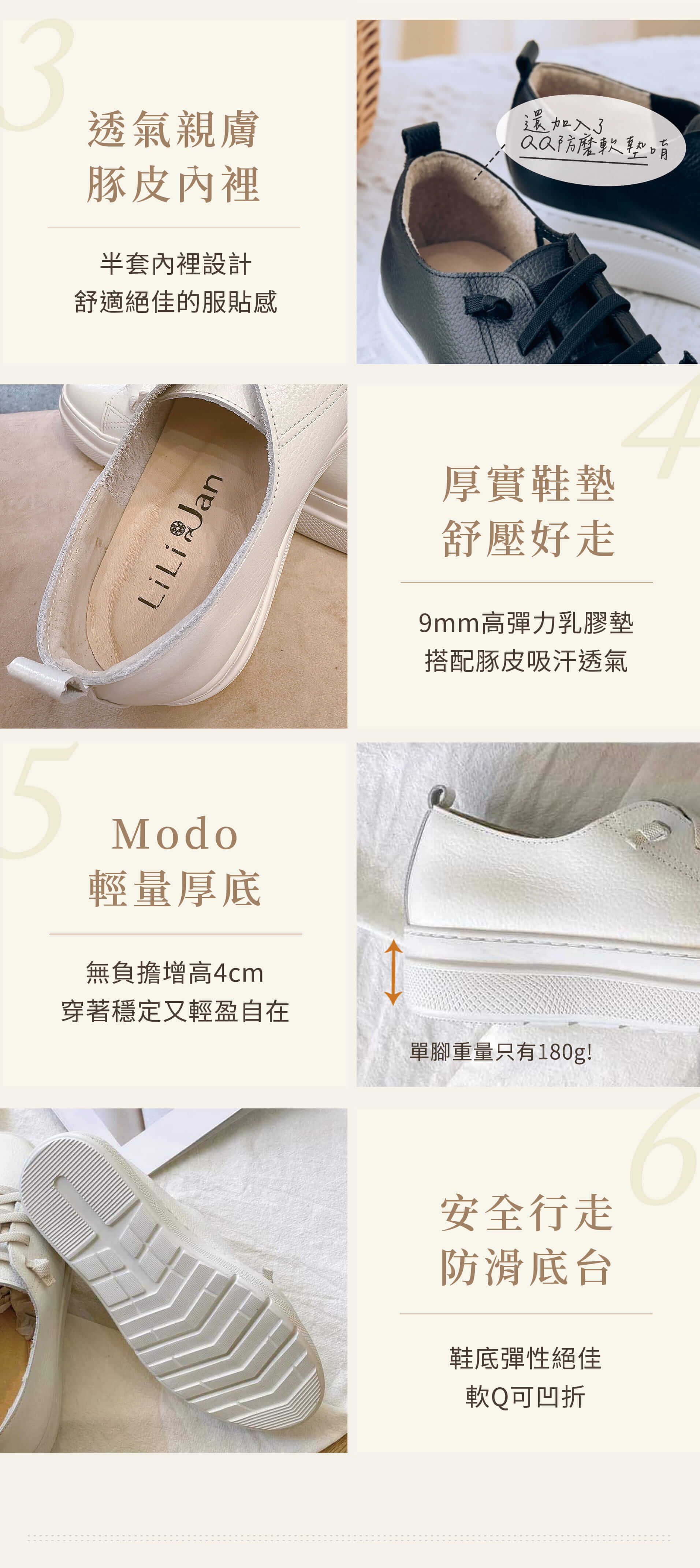 日本進口Nappa軟牛皮 零著感的輕巧百搭款 免綁帶設計方便穿脫 透氣豚皮內裡+厚實9mm彈力乳膠墊 modo輕量4cm增高鞋底,防滑耐磨。 版型正常,建議拿【原尺寸】即可。 若習慣穿襪,可拿【大半號...