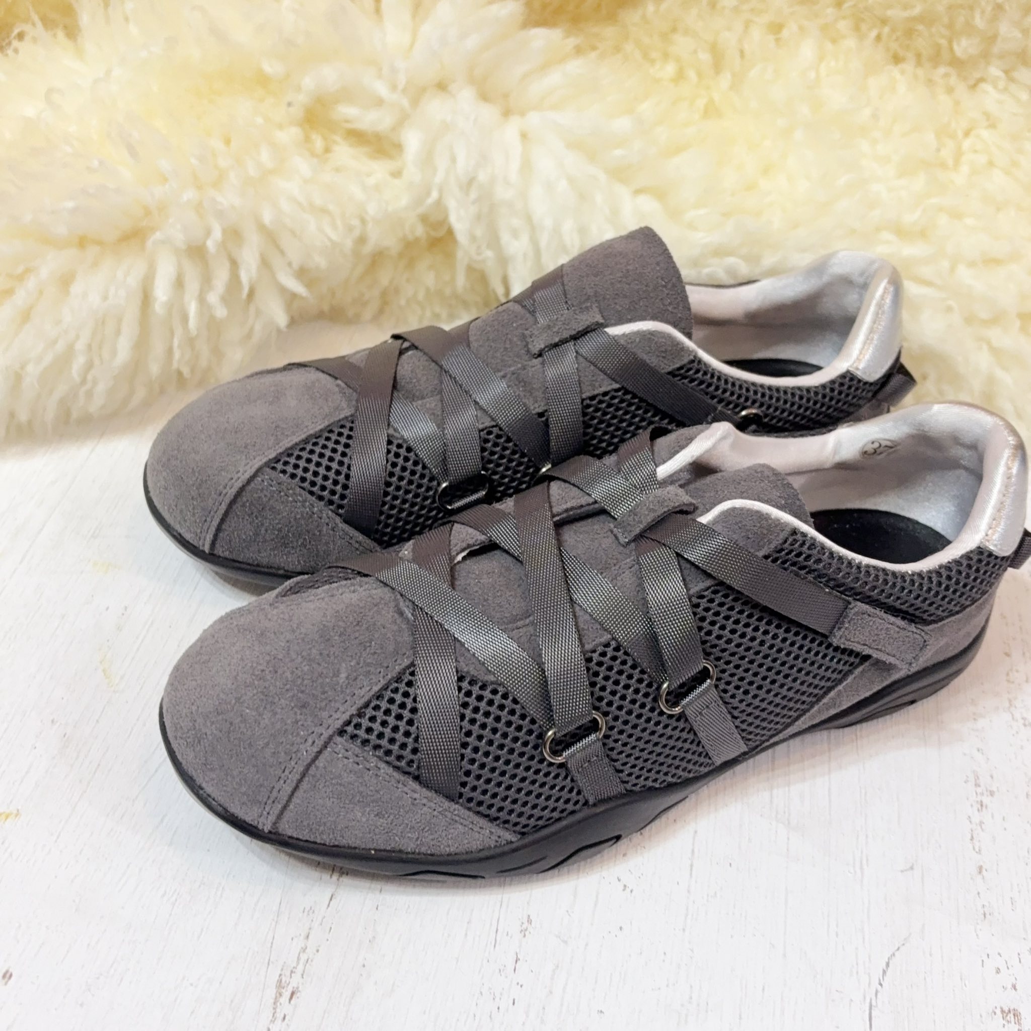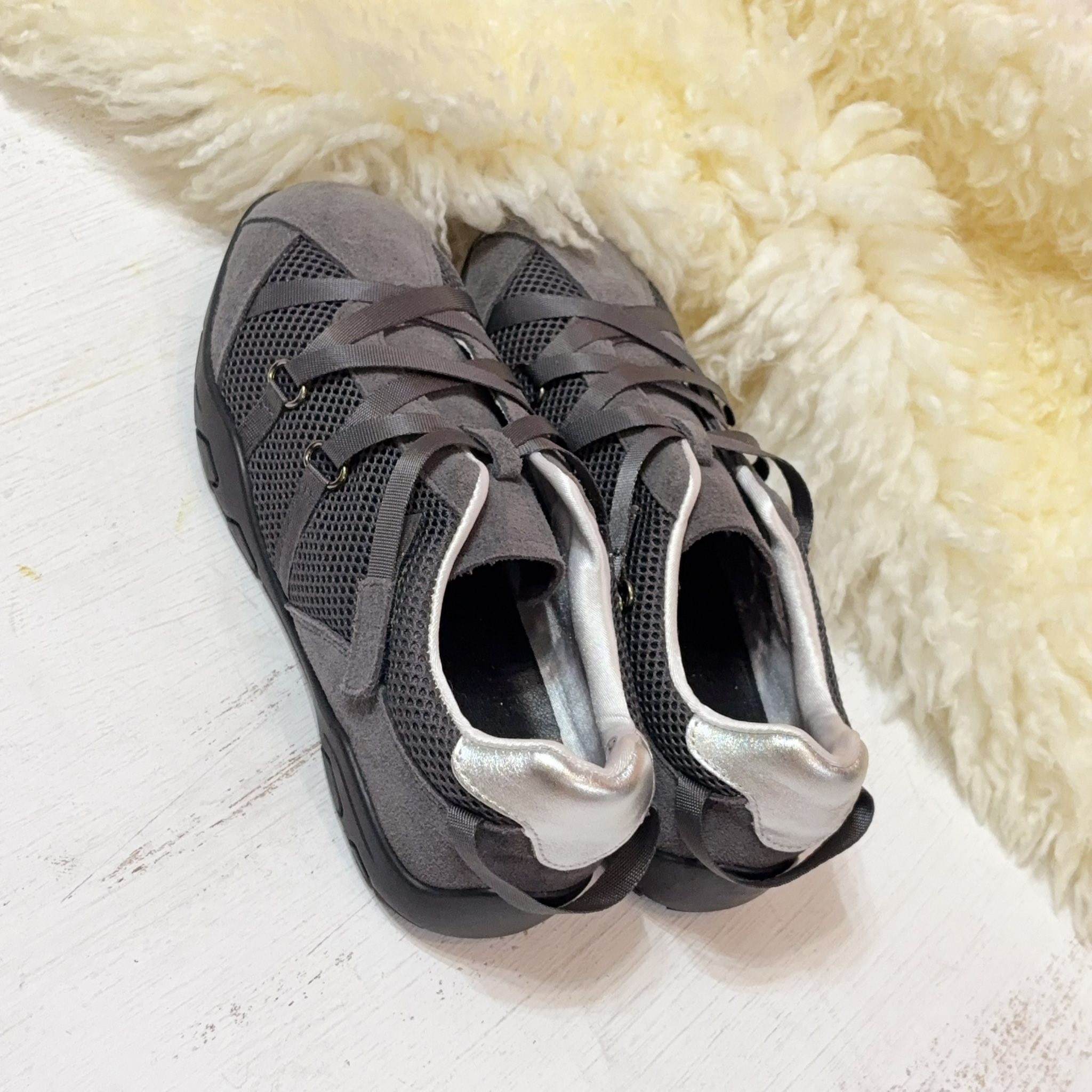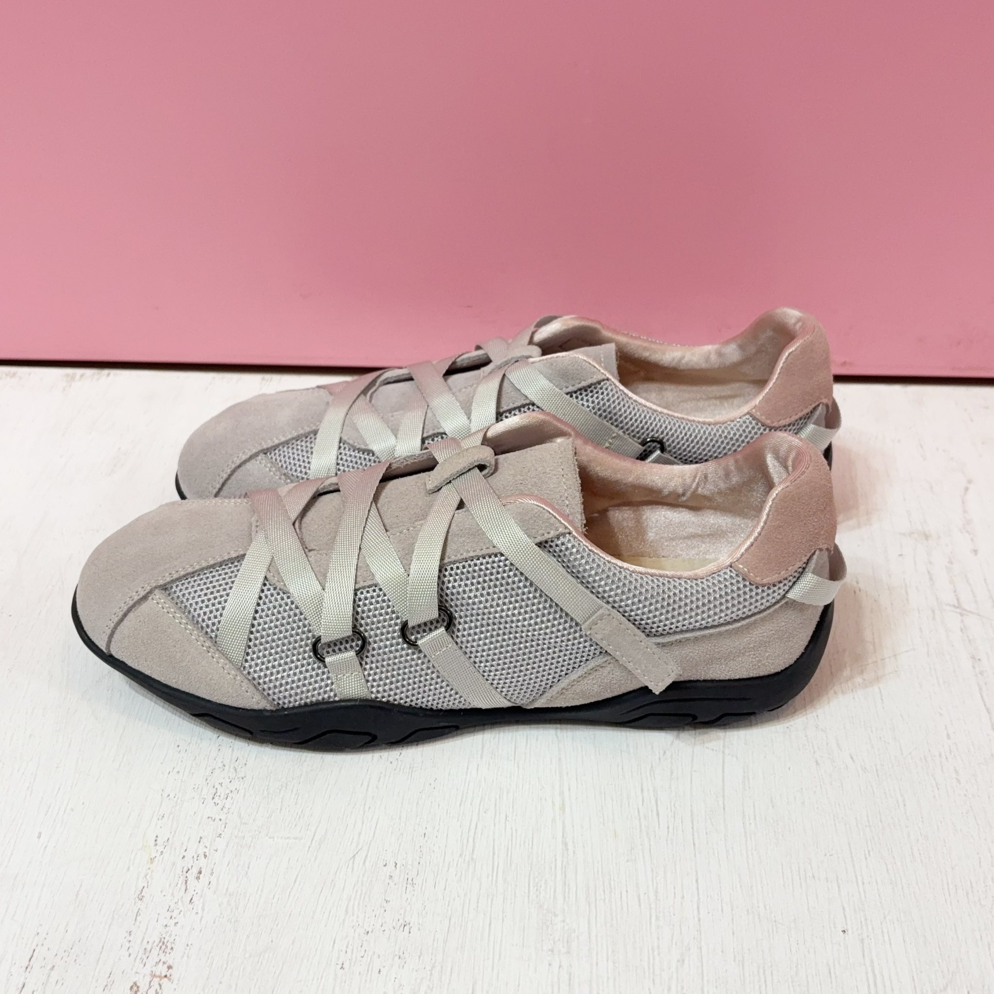 獨特的交叉編織鞋帶設計,不僅包覆感極佳,更散發低調時尚感。內襯選用滑嫩親膚的特殊材質,讓妳無論穿梭城市或休閒運動,