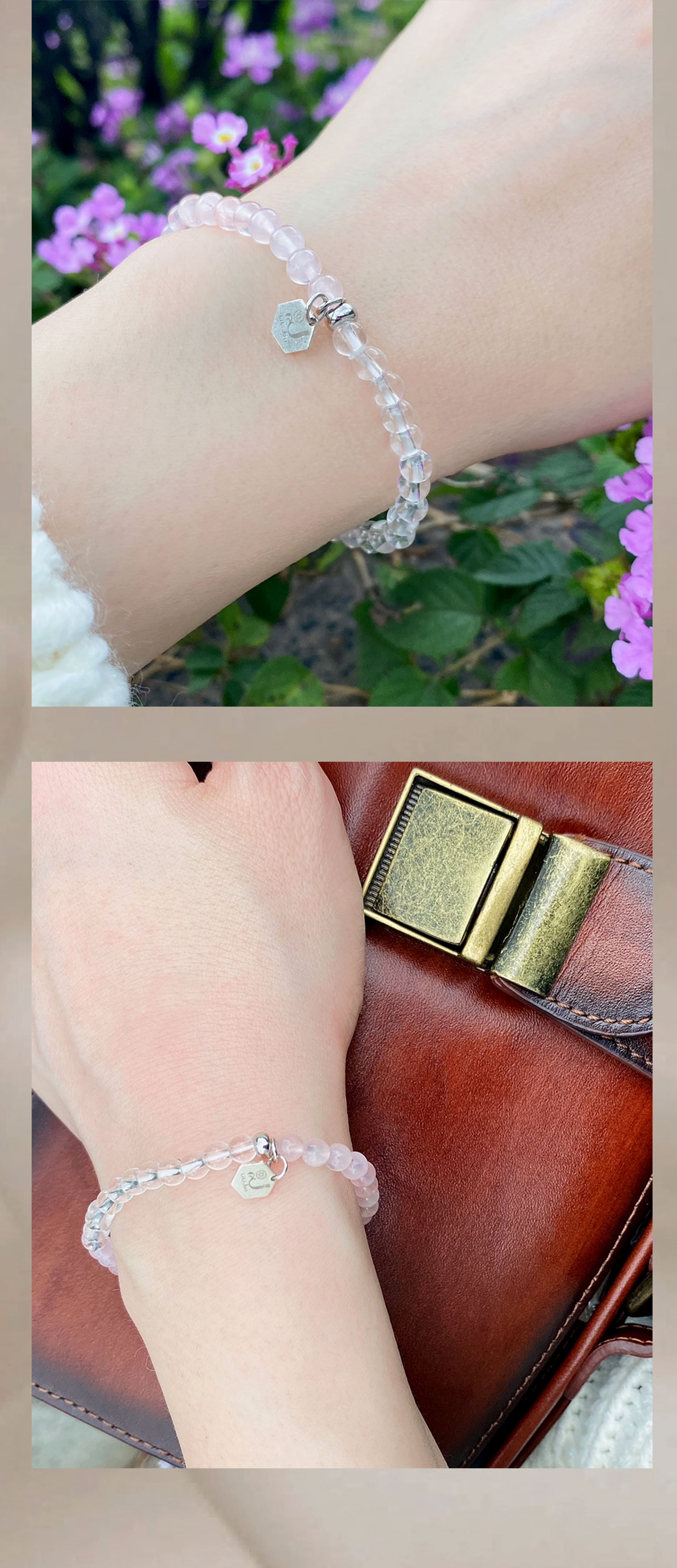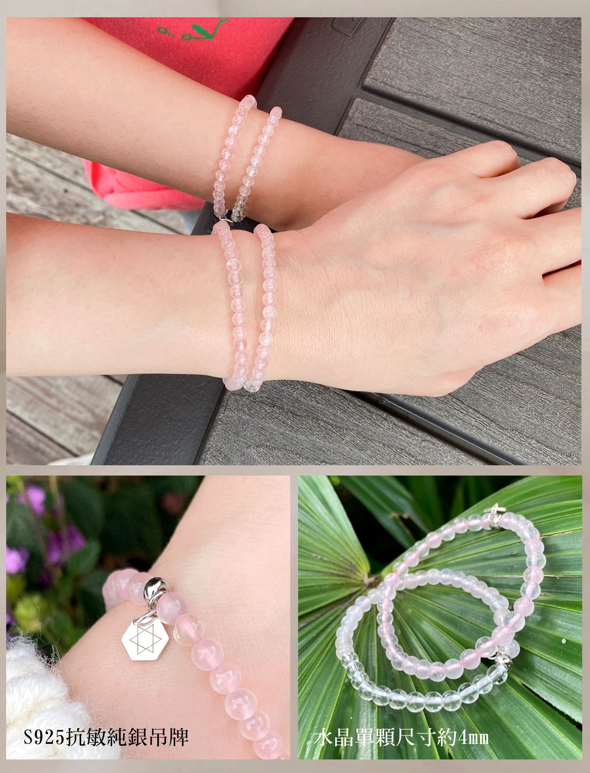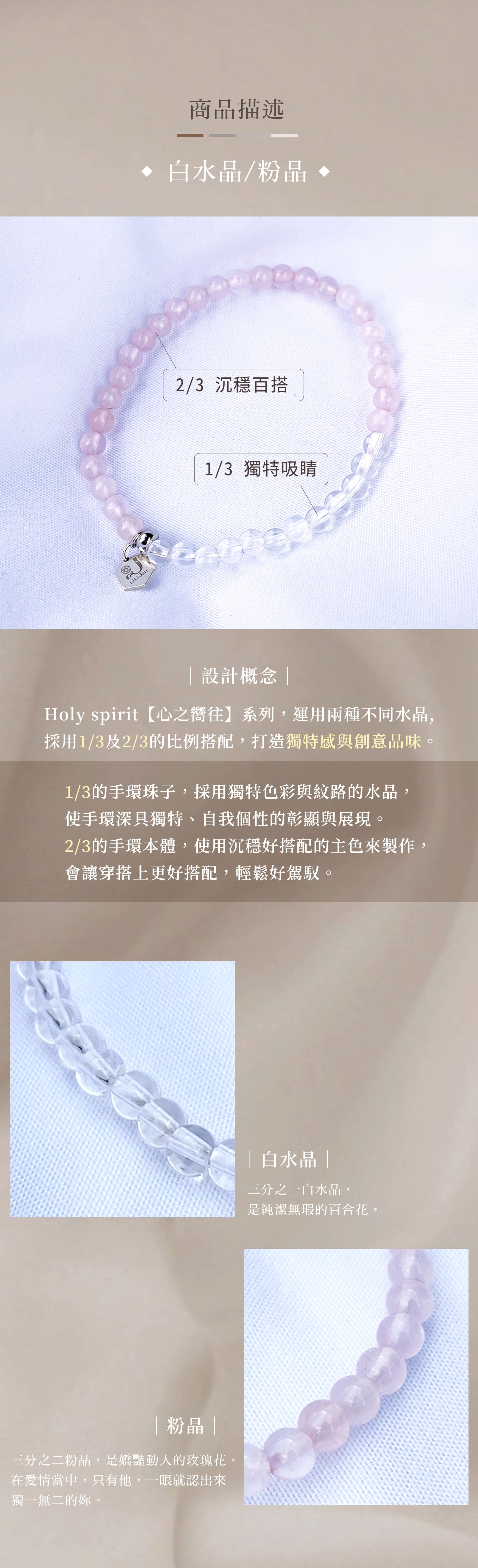 - 天然粉水晶與白水晶交織,象徵豐盈晶透的純潔愛情。