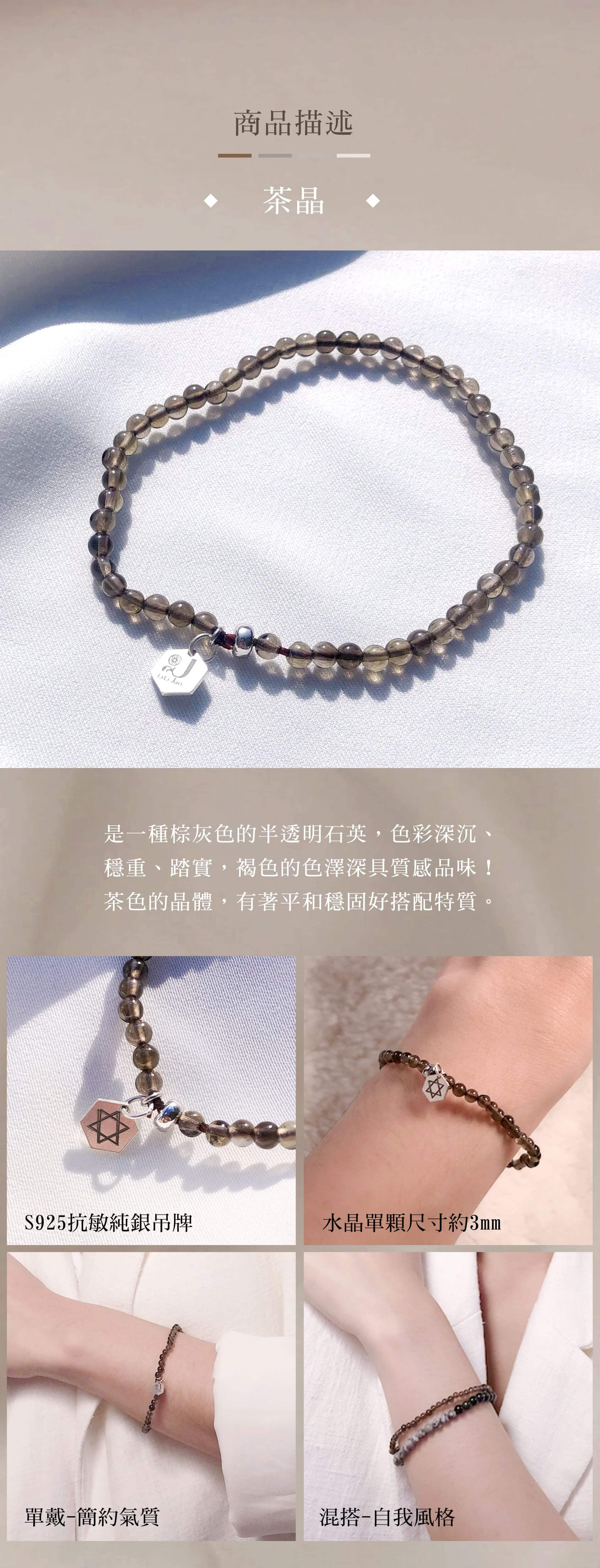 - 是一種棕灰色的半透明石英,色彩深沉、穩重、踏實,褐色的色澤深具質感品味!茶色的晶體,有著平和穩固好搭配特質。