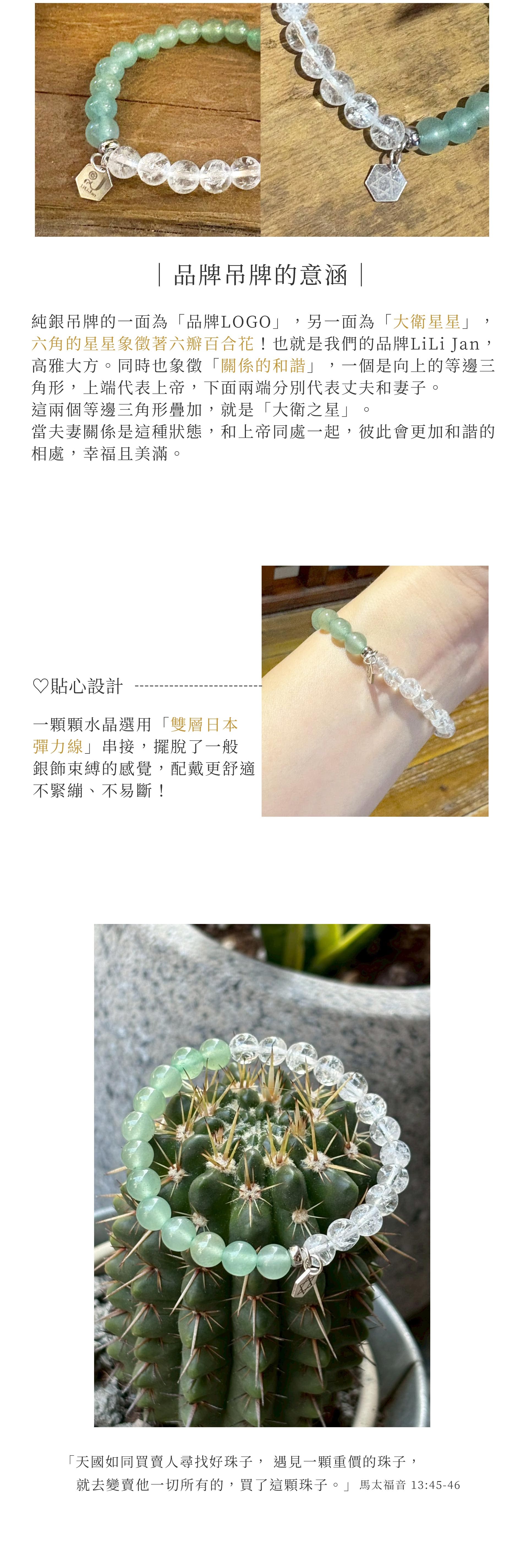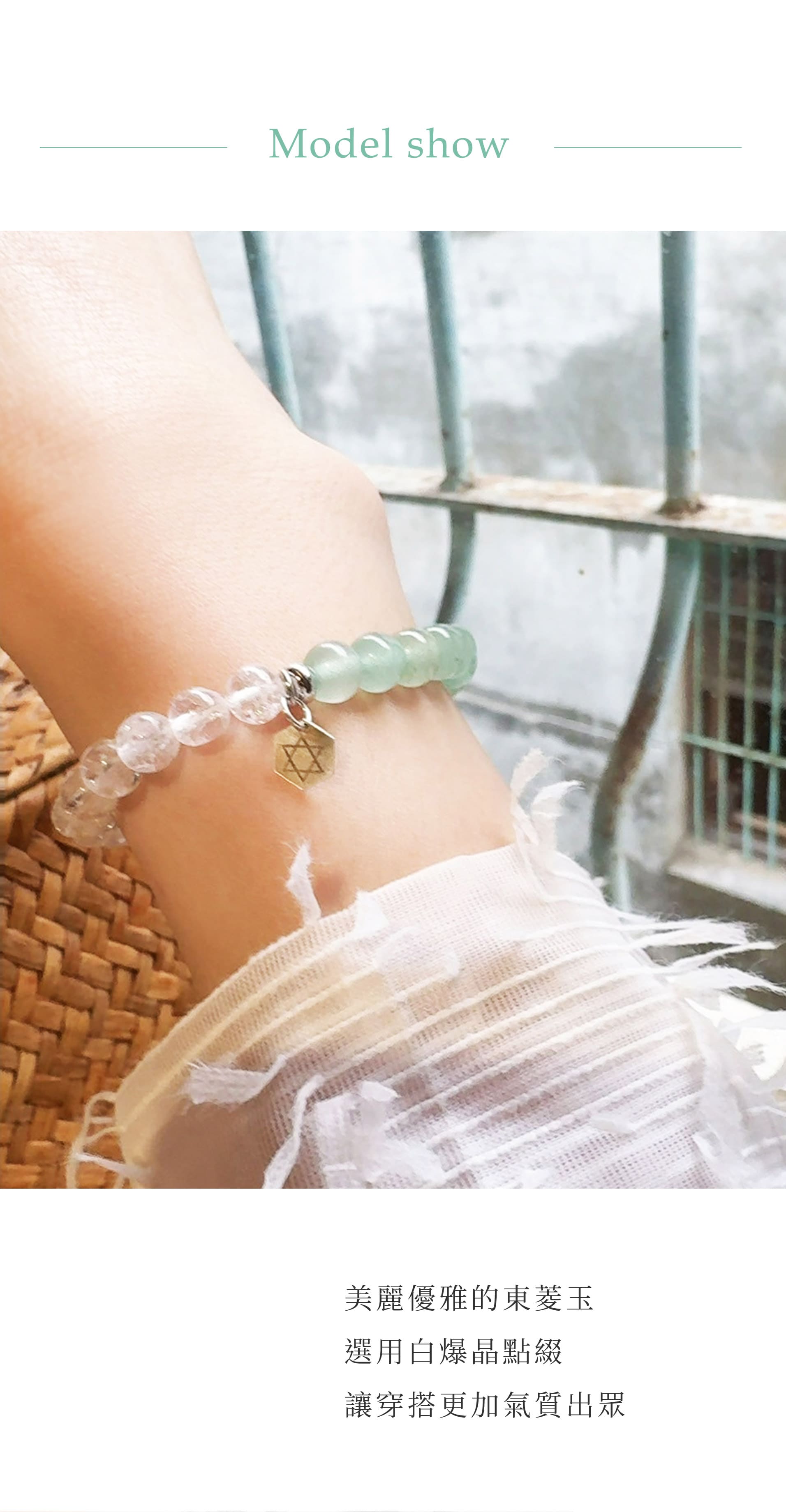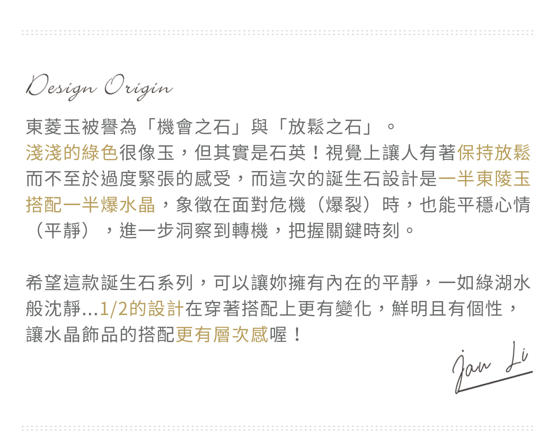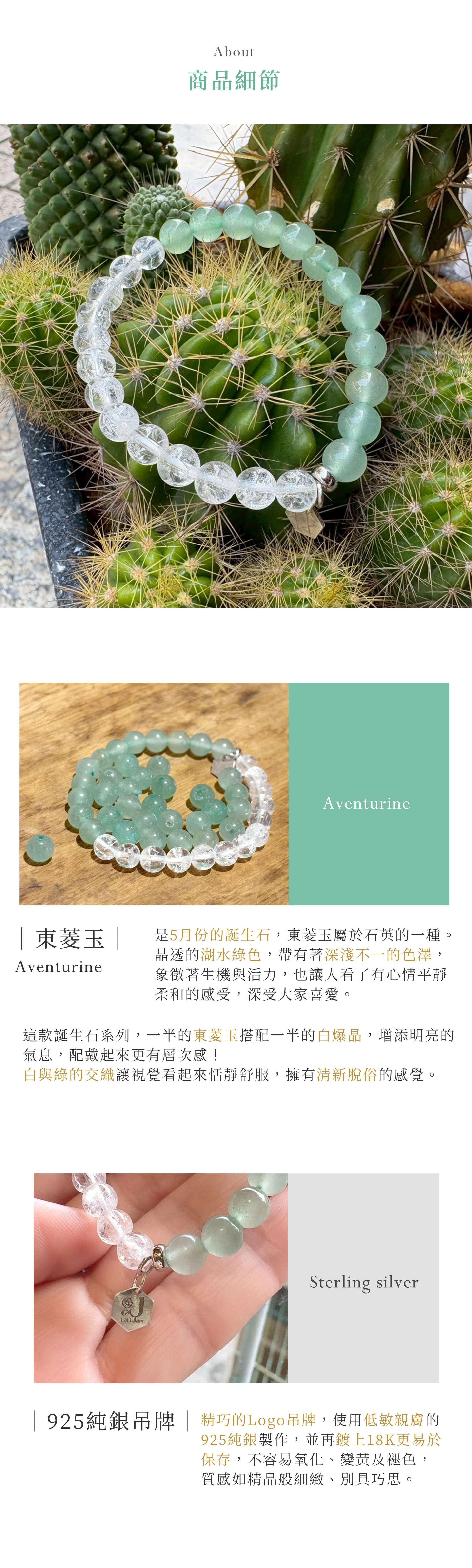 - 5月誕生石「東菱玉」(Aventurine),被譽為「機會之石」與「放鬆之石」。 淺淺的綠色很像玉,但其實是石英!晶透的色澤宛如湖水綠般明亮,這款設計是一半東陵玉+一半爆水晶,白與綠的交織恬靜舒服,清新脫俗的視覺饗宴。