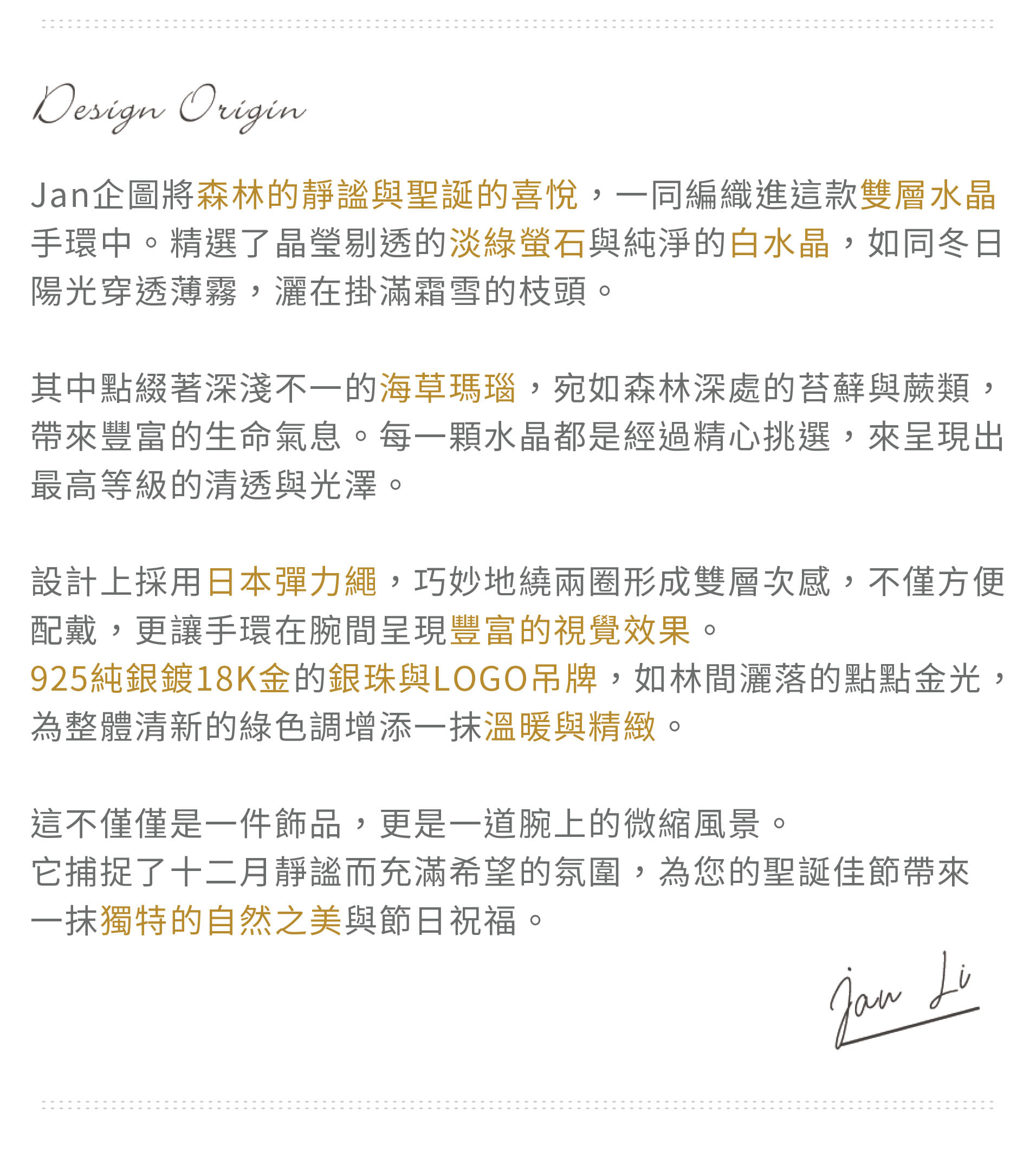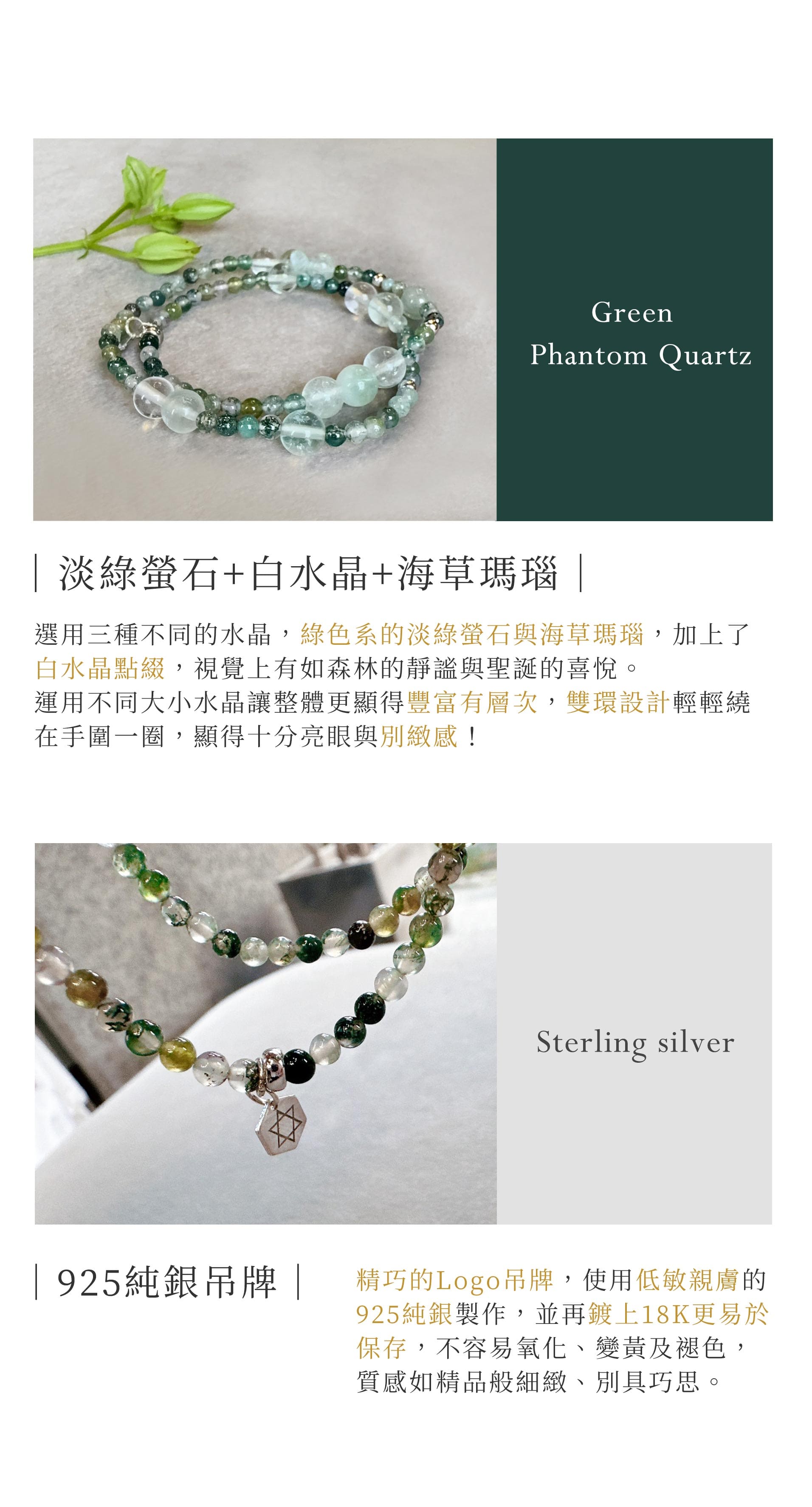 - 12月的幸福綠光!將森林的靜謐與聖誕的喜悅,一同編織進這款雙層水晶手環中。