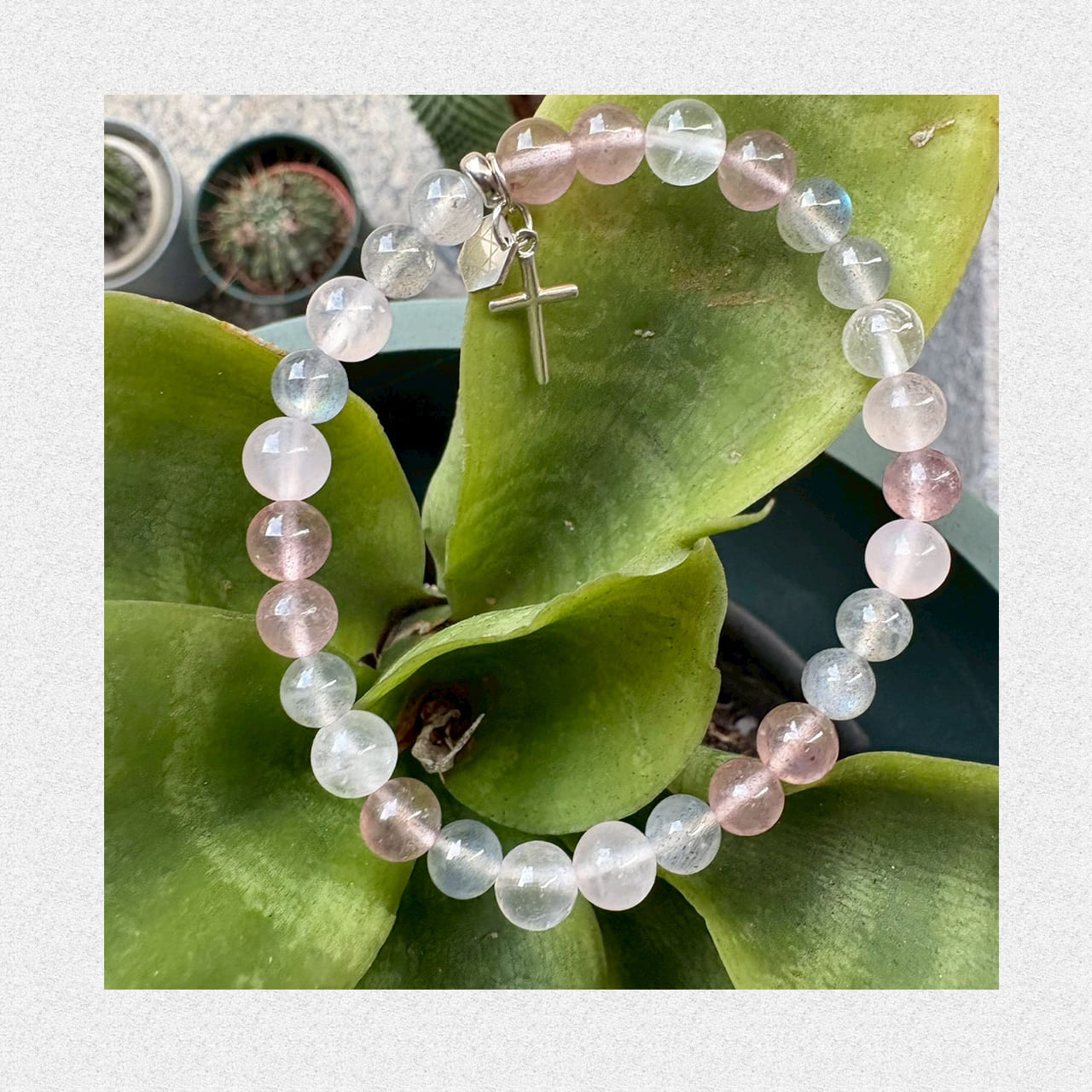 - 三種天然晶石,甜美溫柔的草莓晶、淡雅的粉晶與朦朧神秘的灰月光石,不規則的排列交織出迷人色彩!