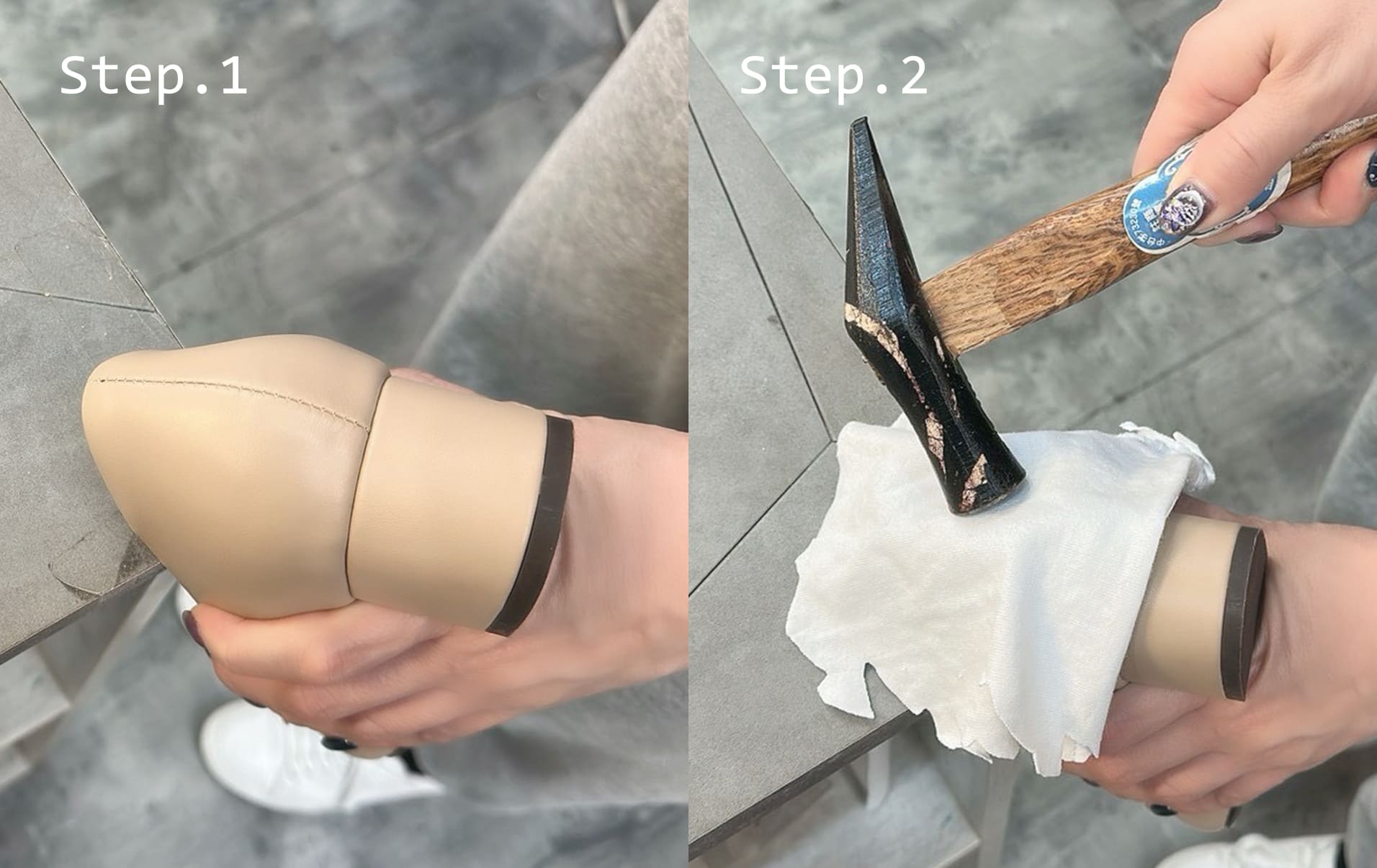6. 將鞋口靠在桌腳,用一塊布墊著(避免傷及皮料),再拿鐵鎚輕敲使其柔軟。